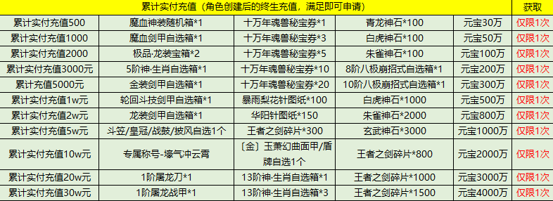 此福利活动只计算真实充值金额,一个账号下仅计算单角色的真实充值进行各档位仅限领取一次,活动随着版本更新进度等可能会出现道具更新内容,若有调整以咨询客服后实际申请到账为准。(真实充值额度:不包含游戏内充值红包等,仅计算玩家真实充值金额)