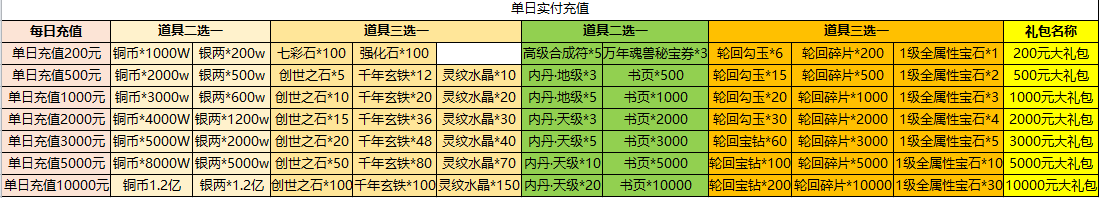 2、道具奖励将在申请后的1~5个工作日内以邮件形式发放;单日充值满足对应档次礼包可获得最多累加奖励但不能重复领取,会根据玩家充值的金额自动为玩家搭配收益最大的奖励方式。玩家收到奖励后在游戏内可选择想要的道具,选错不予另行处理!